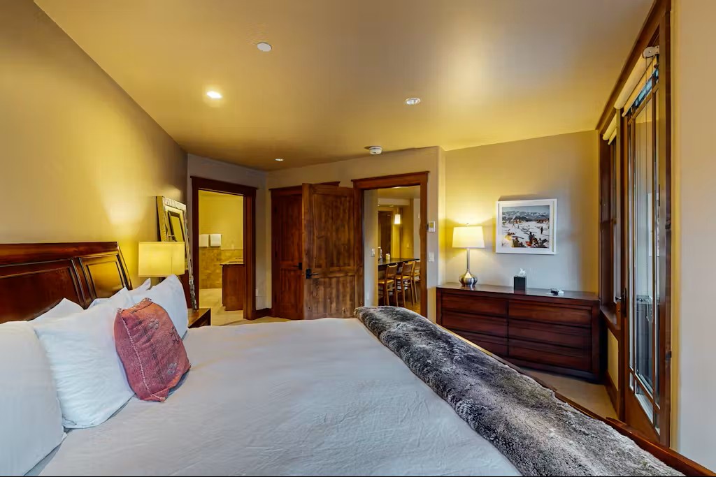The condo comfortably sleeps 5-6 adults (plus up to 2 children) across three thoughtfully designed bedrooms. The spacious primary bedroom features a comfortable king-size bed, while the second bedroom offers a queen bed. The bunk room is a hit with kids, featuring a queen-size lower bunk and two narrower twin bunks perfect for smaller guests under five feet tall.