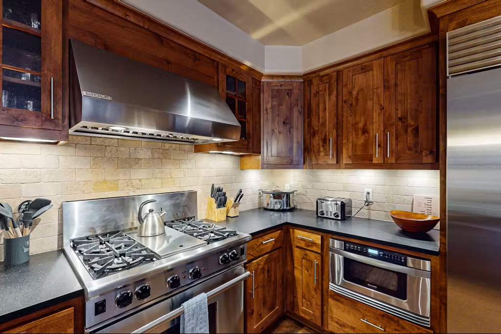 Step into the bright and welcoming open-concept living area, where warm wood accents and a gas fireplace create a cozy, inviting atmosphere. The space is perfect for unwinding after a day on the slopes or a summer festival. The well-equipped kitchen features a dishwasher, fridge, stove, and microwave, making it easy to prepare meals for the whole group.