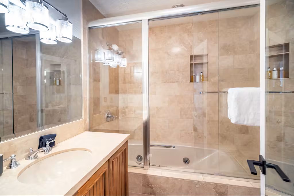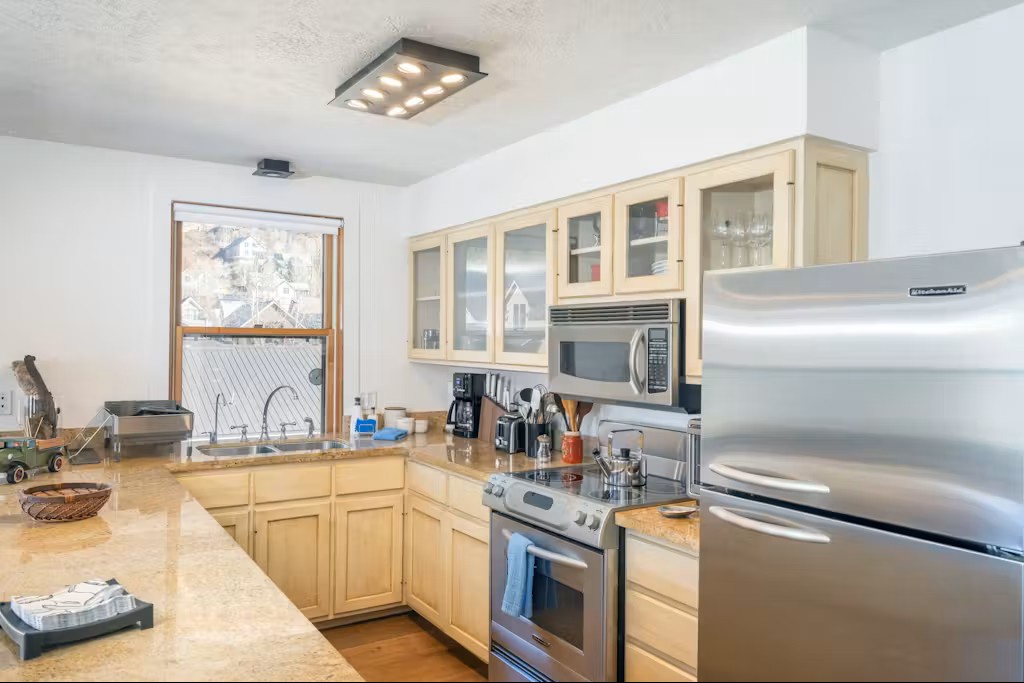 The inviting living area features an open-concept design, cozy seating, a flat-screen TV, and those epic mountain views. A fully equipped kitchen with stainless steel appliances, microwave, and coffee maker makes meal prep effortless—whether you’re whipping up breakfast before a day on the slopes or hosting après-ski drinks with friends.