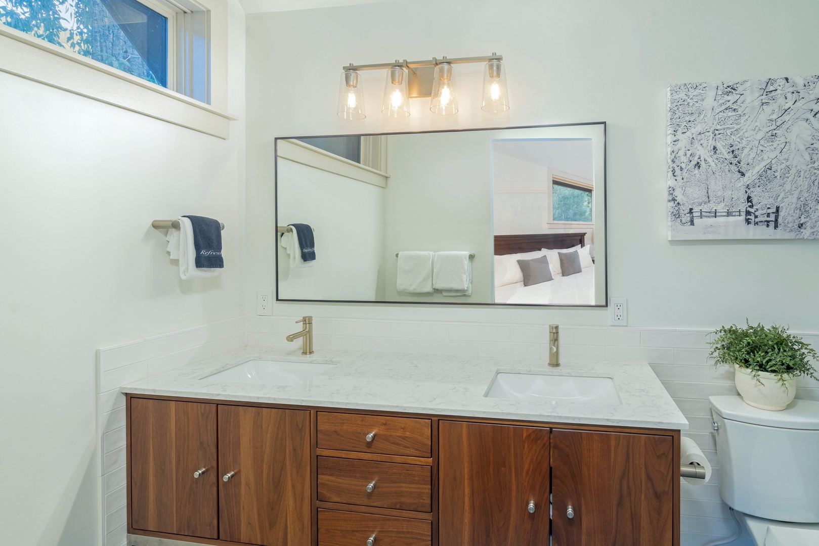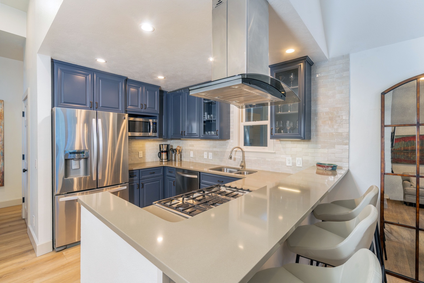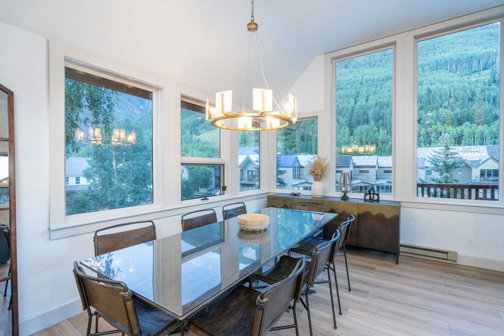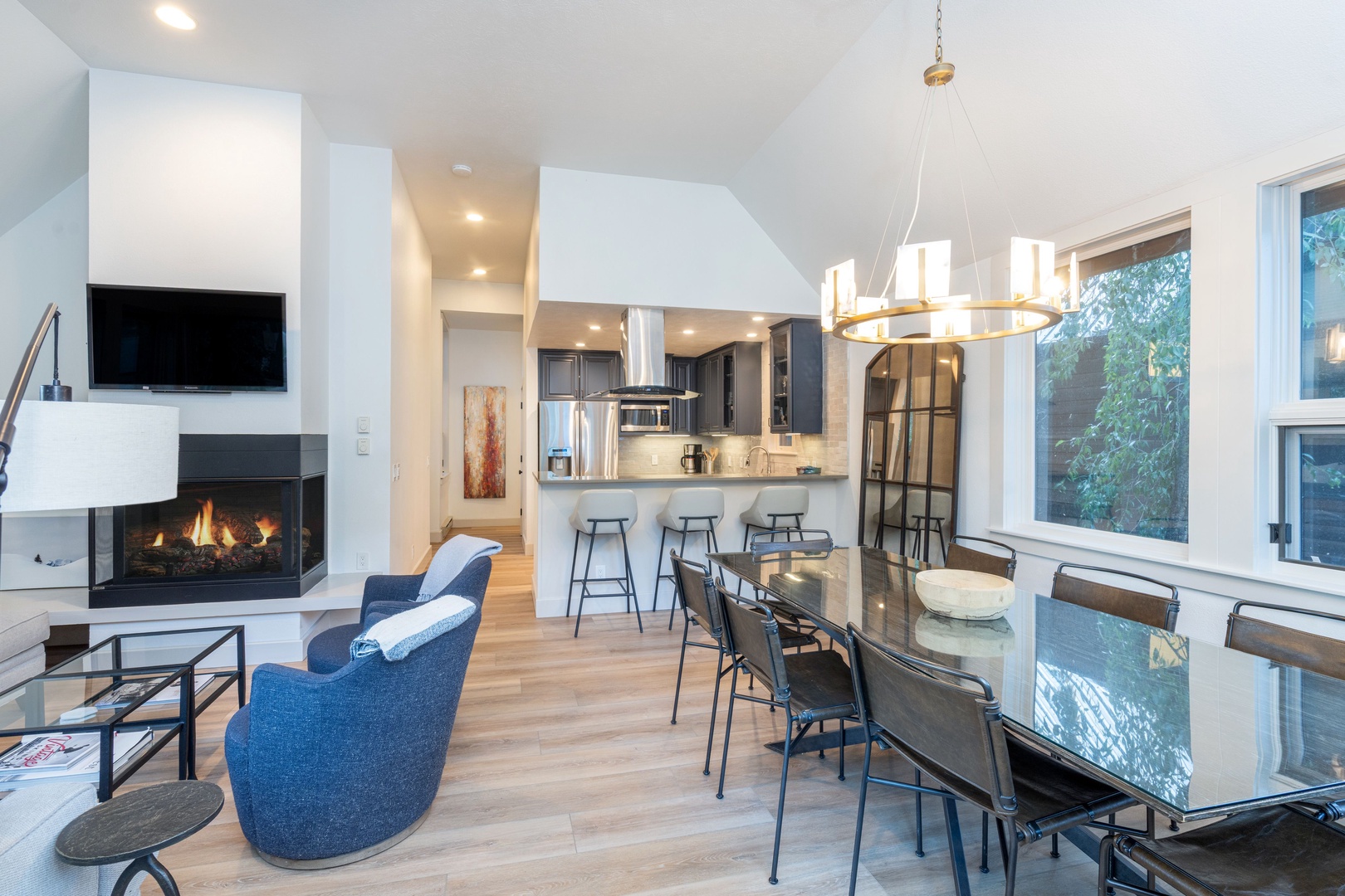 The fully updated kitchen features sleek countertops, stainless steel appliances, and a spacious island with bar seating for 3—ideal for morning coffee or casual après-ski snacks. Share meals and memories around the dining table for 8, set beneath modern lighting and surrounded by mountain views.