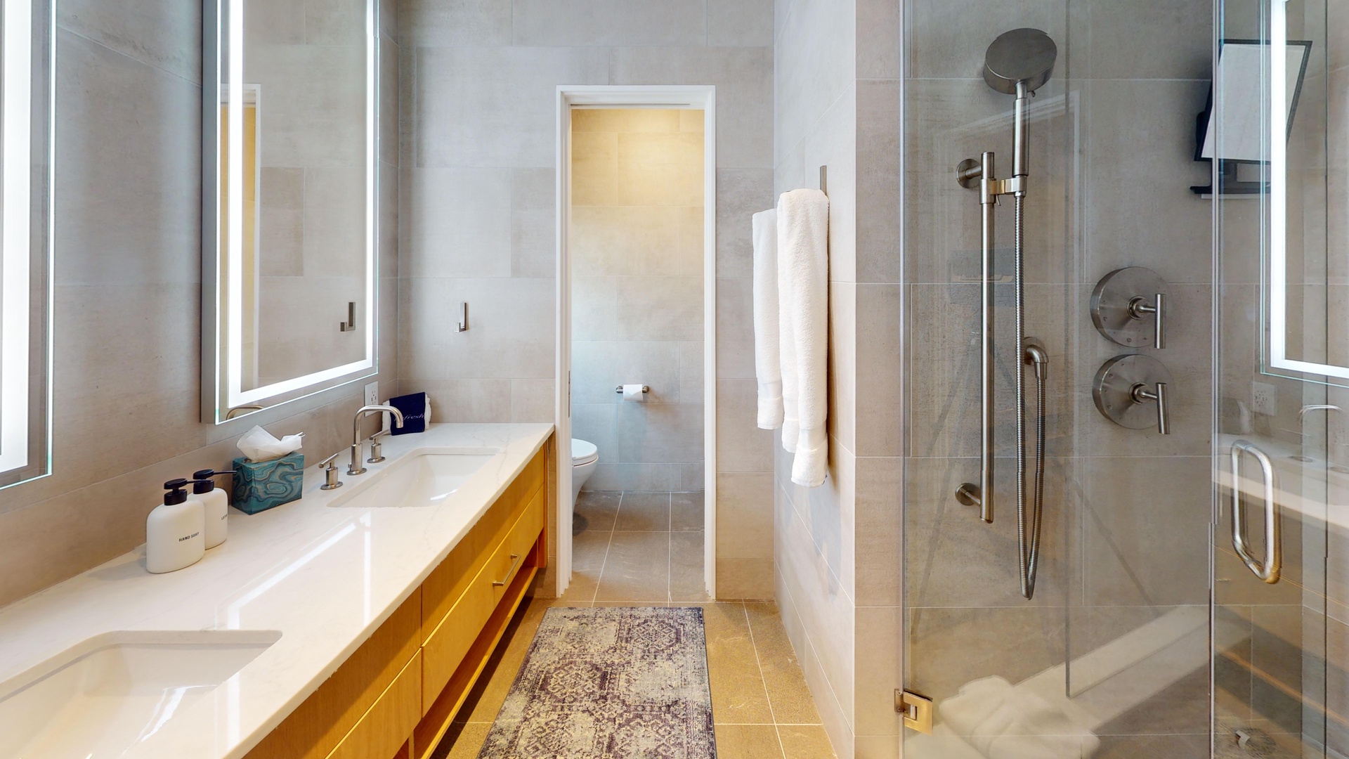 The primary bedroom is a haven of comfort, offering beautiful views, soft linens, a large Smart TV, and an en suite bathroom. Pamper yourself in the en suite bathroom with dual sinks and a walk-in steam shower. Every room in the home is bright and airy, ensuring everyone's comfort. For those working remotely, a dedicated office space is available, and the washer/dryer will keep your adventure gear fresh. Interior amenities include partial air conditioning, radiant floor heating, and internet access.
