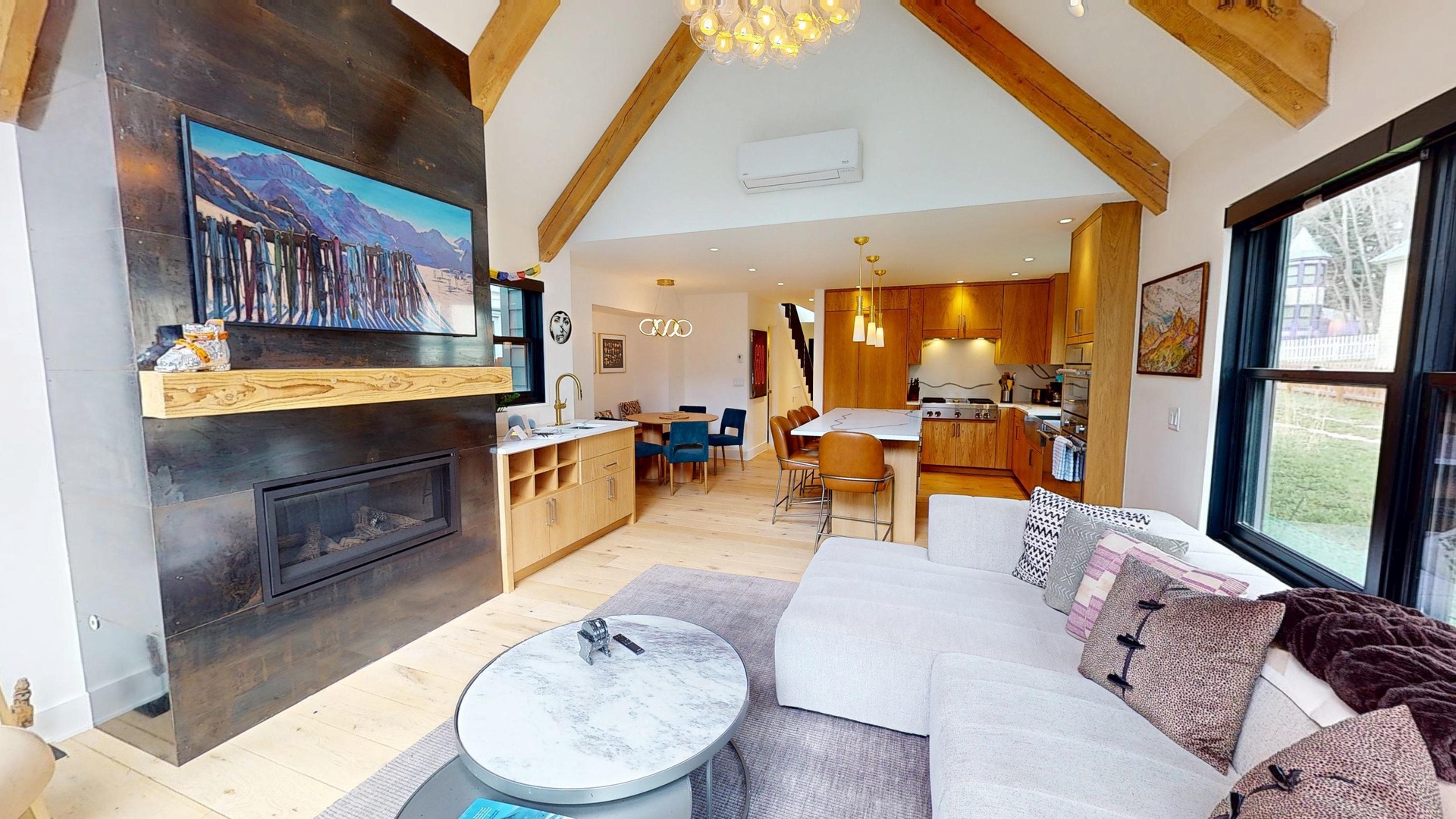 Unwind in the inviting living room, featuring vaulted ceilings, a plush oversized sofa, a large TV, and a cozy gas fireplace. The adjacent full kitchen is a chef's delight, boasting high-end appliances, a farmhouse sink, marble countertops, and a spacious center island. Enjoy meals at the breakfast bar or the formal dining table.