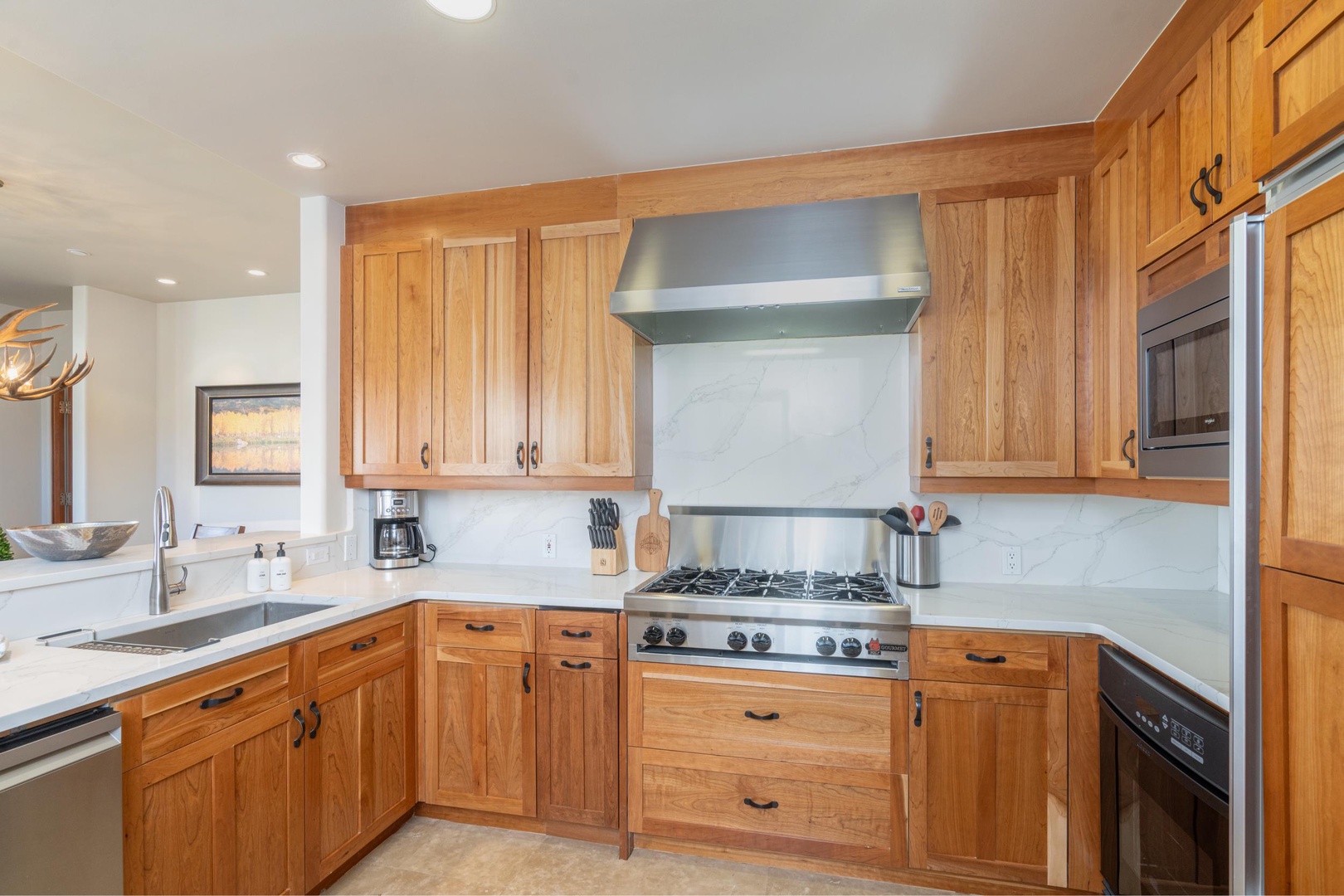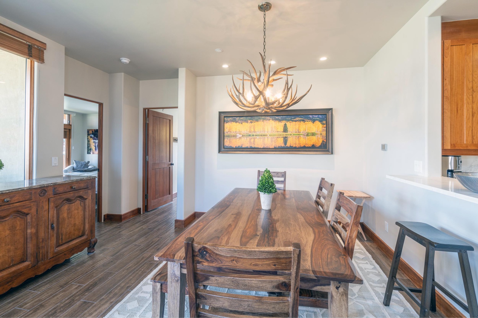 The open-concept living area is warm and inviting, centered around a gas fireplace and furnished with rich textures and modern mountain décor. A fully equipped chef’s kitchen with high-end appliances and a generous dining area makes it easy to gather for meals or après-ski evenings in.