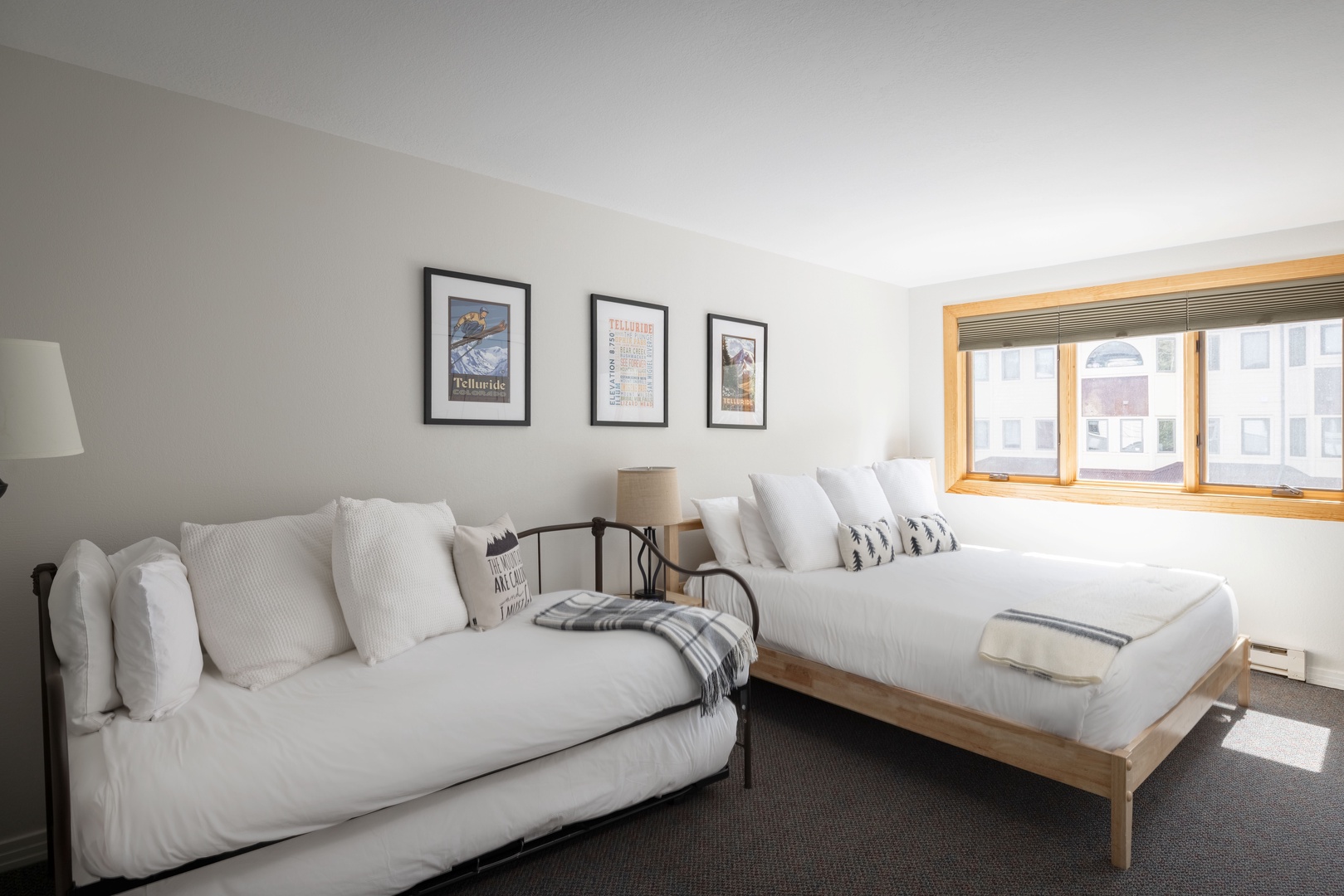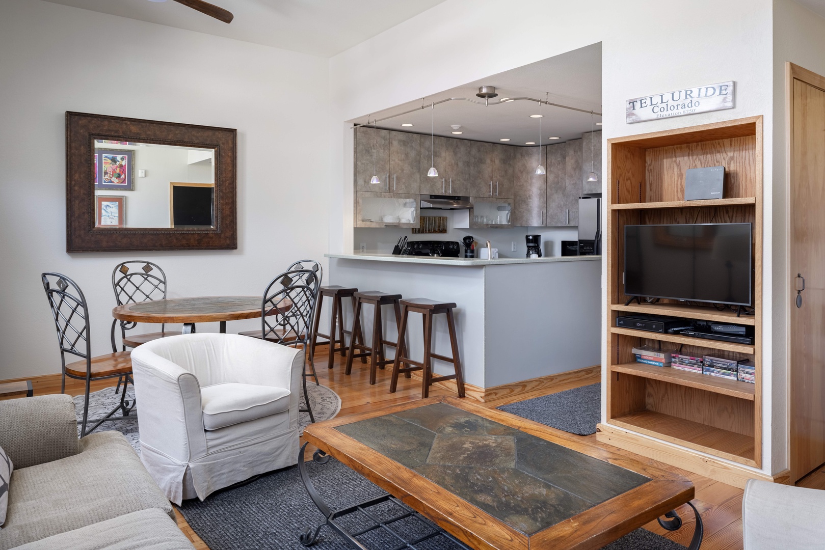 From the condo, you’ll enjoy stunning western views across the valley floor and eastern views of the pool, aspen trees, and the charming rooftops of town nestled in Telluride’s iconic box canyon. You're just a two-minute stroll to Lift 7 —meaning no need to drive or shuttle to the slopes—and the River Trail is only steps from the front door, offering scenic, easy access to downtown, local shops, restaurants, and trails. Even the grocery store is just around the corner, making life simple and stress-free.
