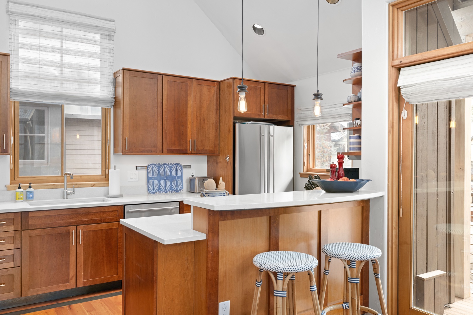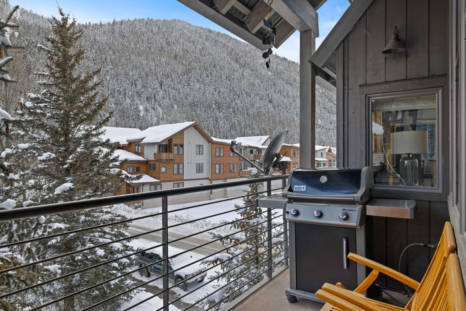 The home features fresh decor, a spacious kitchen with a breakfast bar, a custom bar nook, and a convenient powder room off the living area, providing plenty of room for your entire group. Additionally, the covered, snow-melt balcony allows you to step outside in winter to take in views of the ski resort and check the snow report, or enjoy the crisp summer air and stunning mountain scenery.