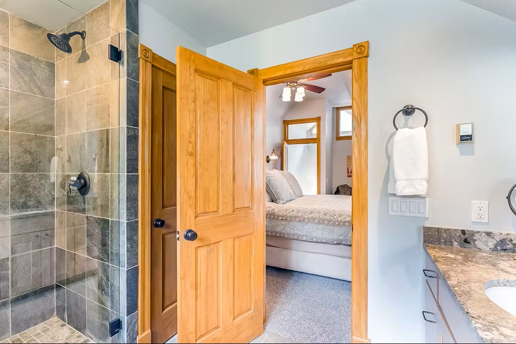 The main living area, located on the second floor, features an open-concept layout that brings everyone together. A chef’s kitchen with high-end appliances and plenty of counter space makes cooking a joy, whether you’re preparing après-ski comfort food or a gourmet dinner. The kitchen flows easily into the dining area and living room, where a cozy fireplace and natural light set the scene for gathering with family and friends.