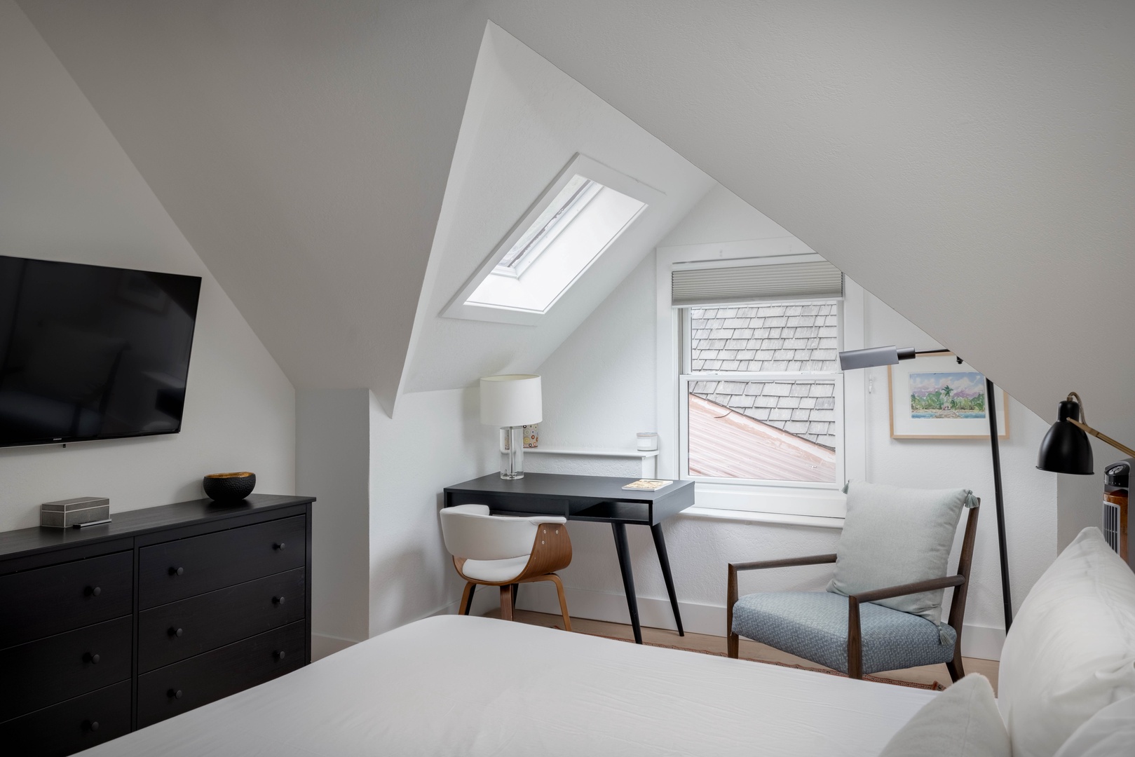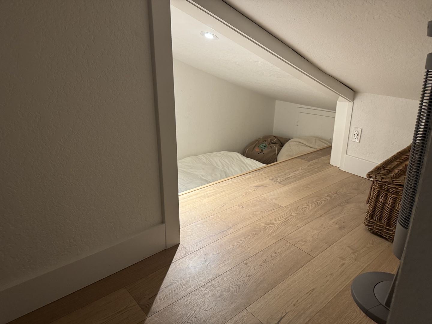 Up the spiral staircase, you'll find a peaceful king bedroom, a twin XL room, and a cozy sleeping nook with a full-size mattress—perfect for kids. Another full bath and laundry area complete the upstairs layout.