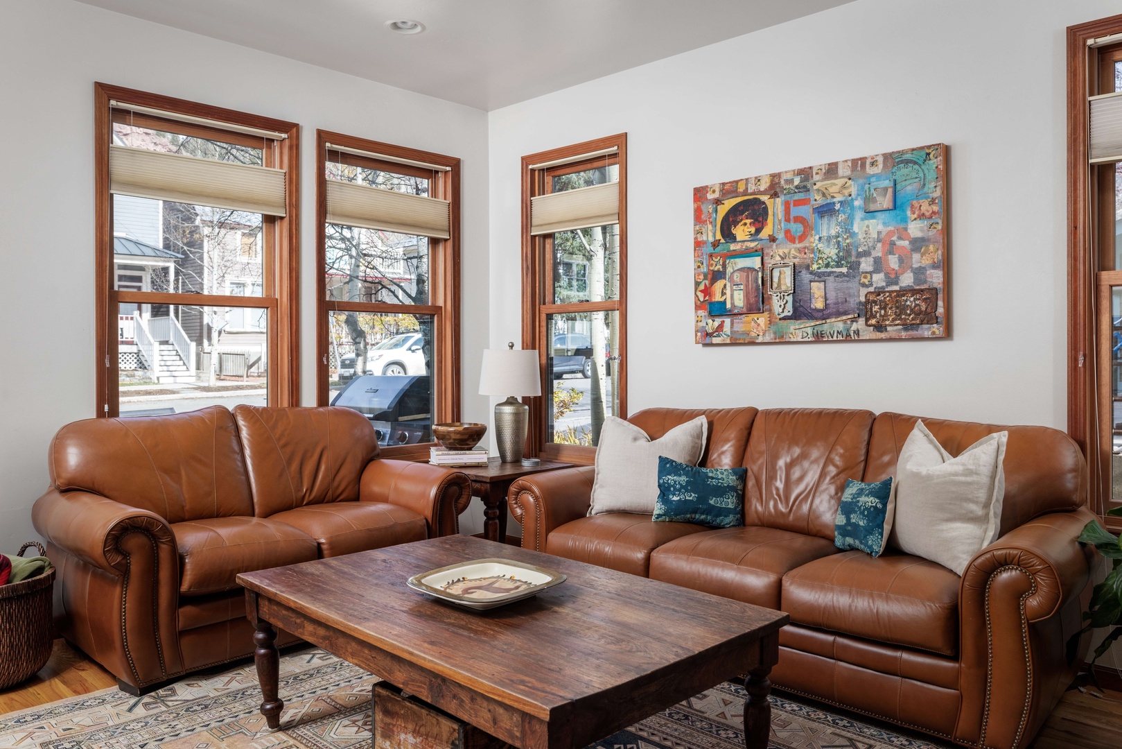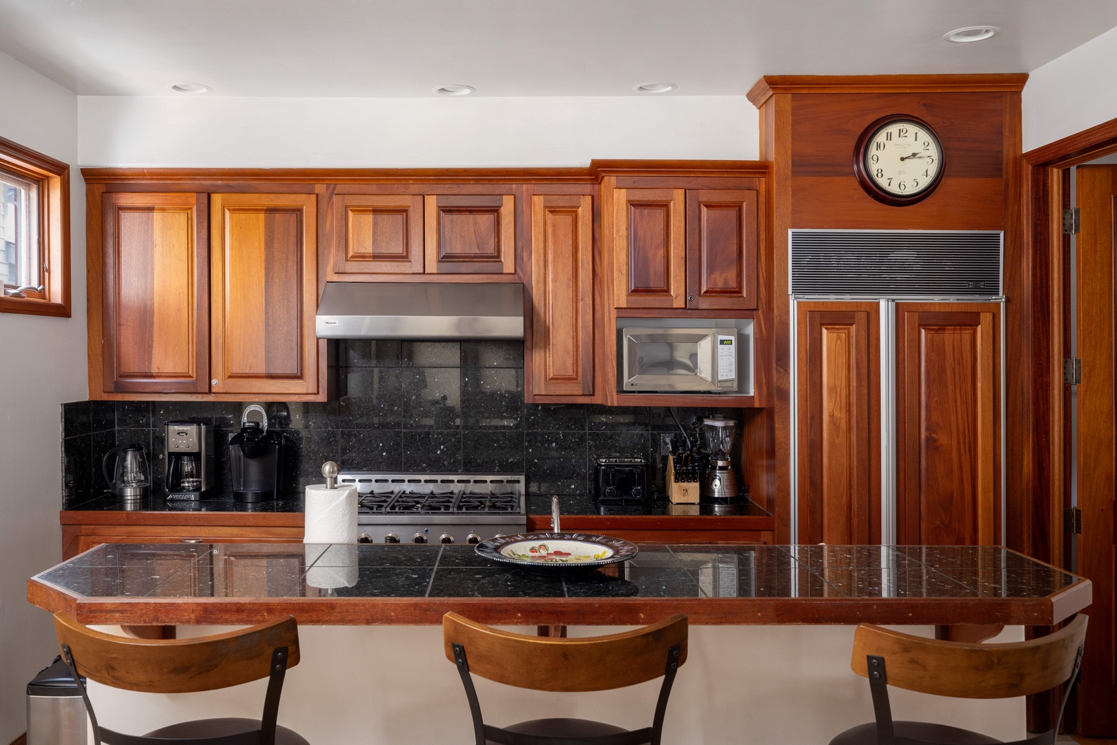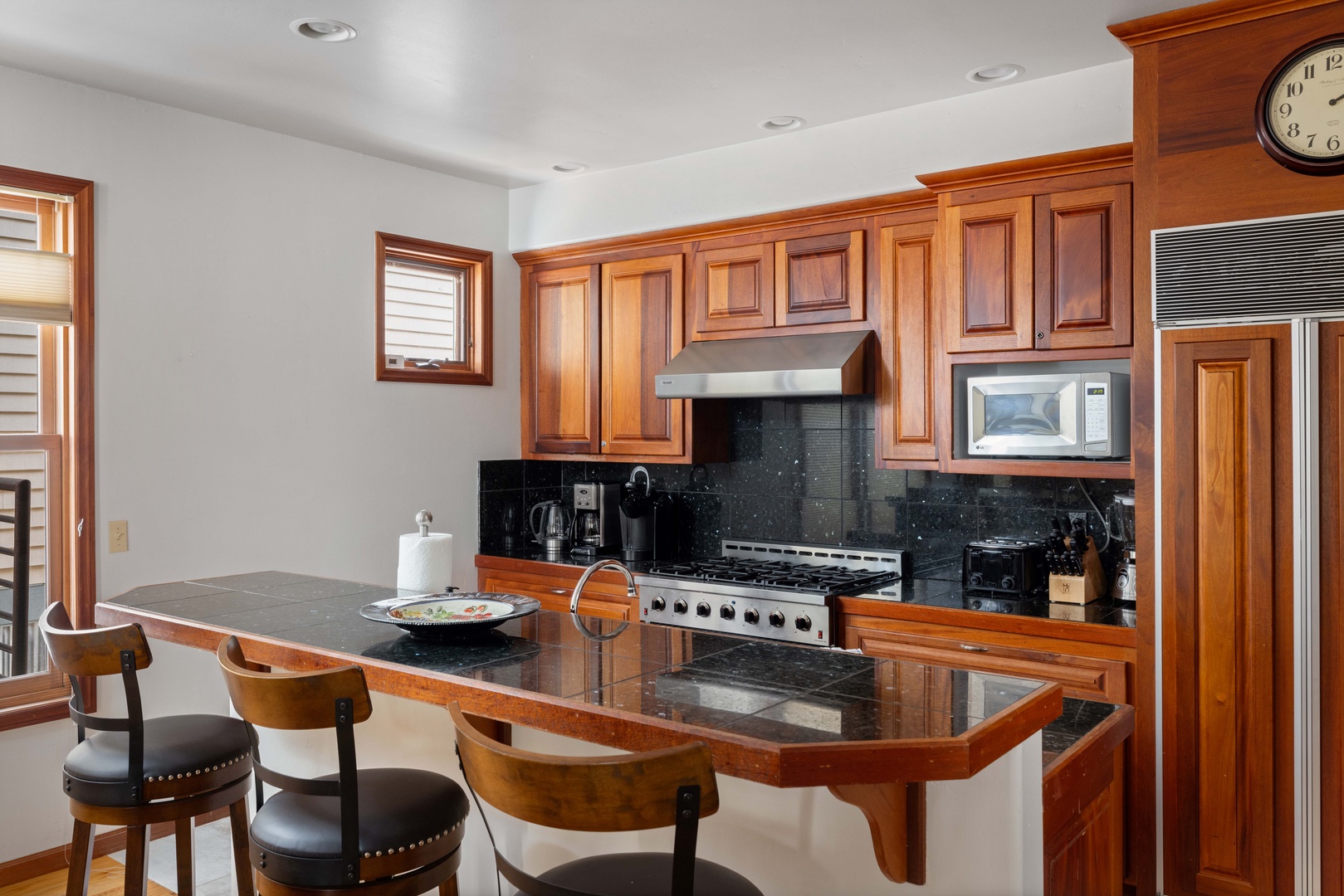 The main living area combines the living room and kitchen, both filled with natural light from windows overlooking Pacific Street. A gas fireplace anchors the living room, which is furnished with two leather sofas and a cozy recliner. A flat-screen TV and DVD player complete the space. Nearby, the fully equipped gourmet kitchen features top-of-the-line stainless steel appliances, both a Keurig and Cuisinart drip coffee maker, and plenty of granite counter space for meal prep. Guests can enjoy casual meals at the breakfast bar with seating for three or gather around the dining table that seats six.