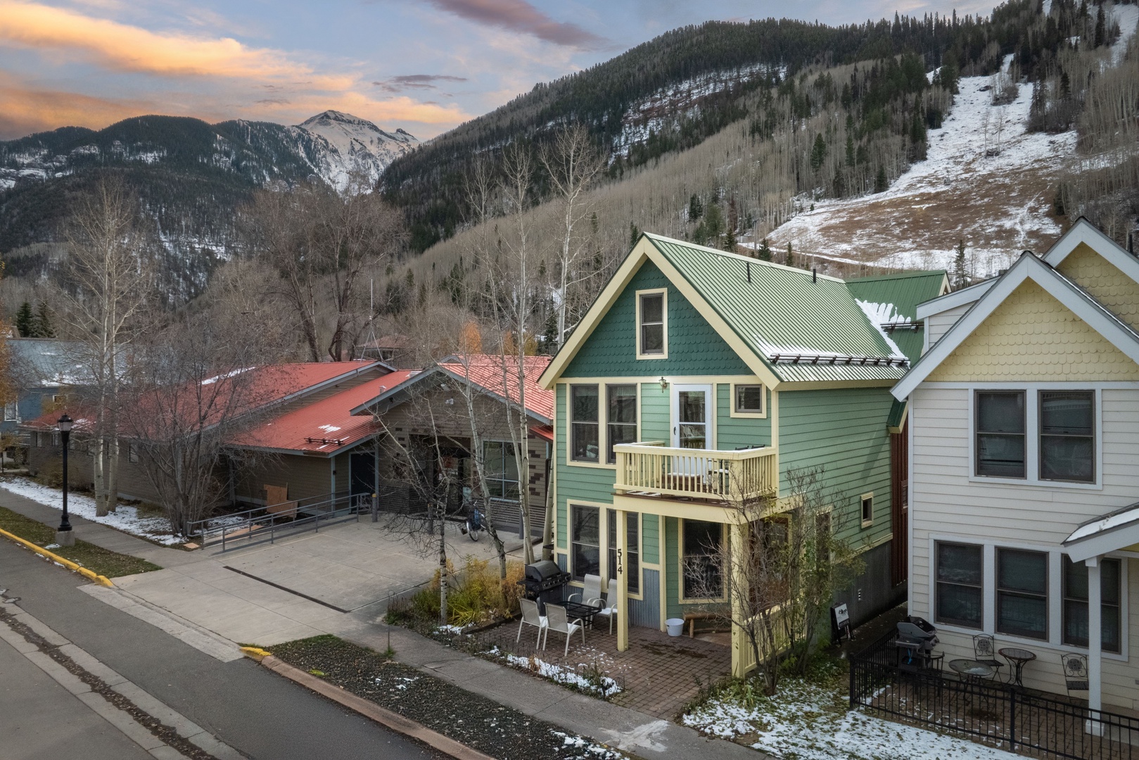 Additional amenities include a parking spot behind the home, a covered front porch with a grill, and outdoor seating. West Pacific Townhome offers everything you need for a relaxing vacation in Telluride.